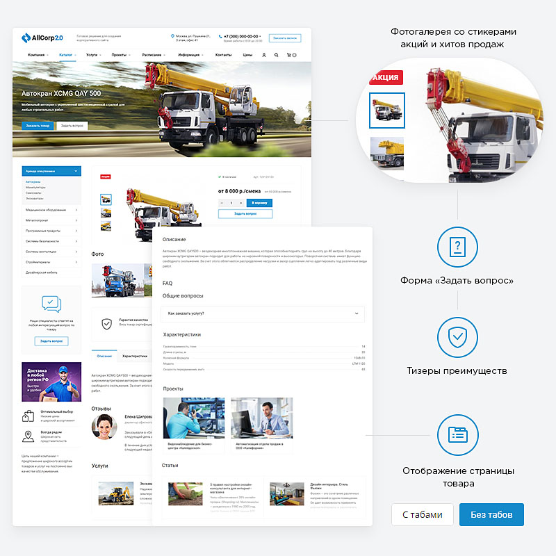- 7 вкладок для информации о товаре: тарифы, описание, фотогалерея, реализованные проекты, характеристики, документы, FAQ